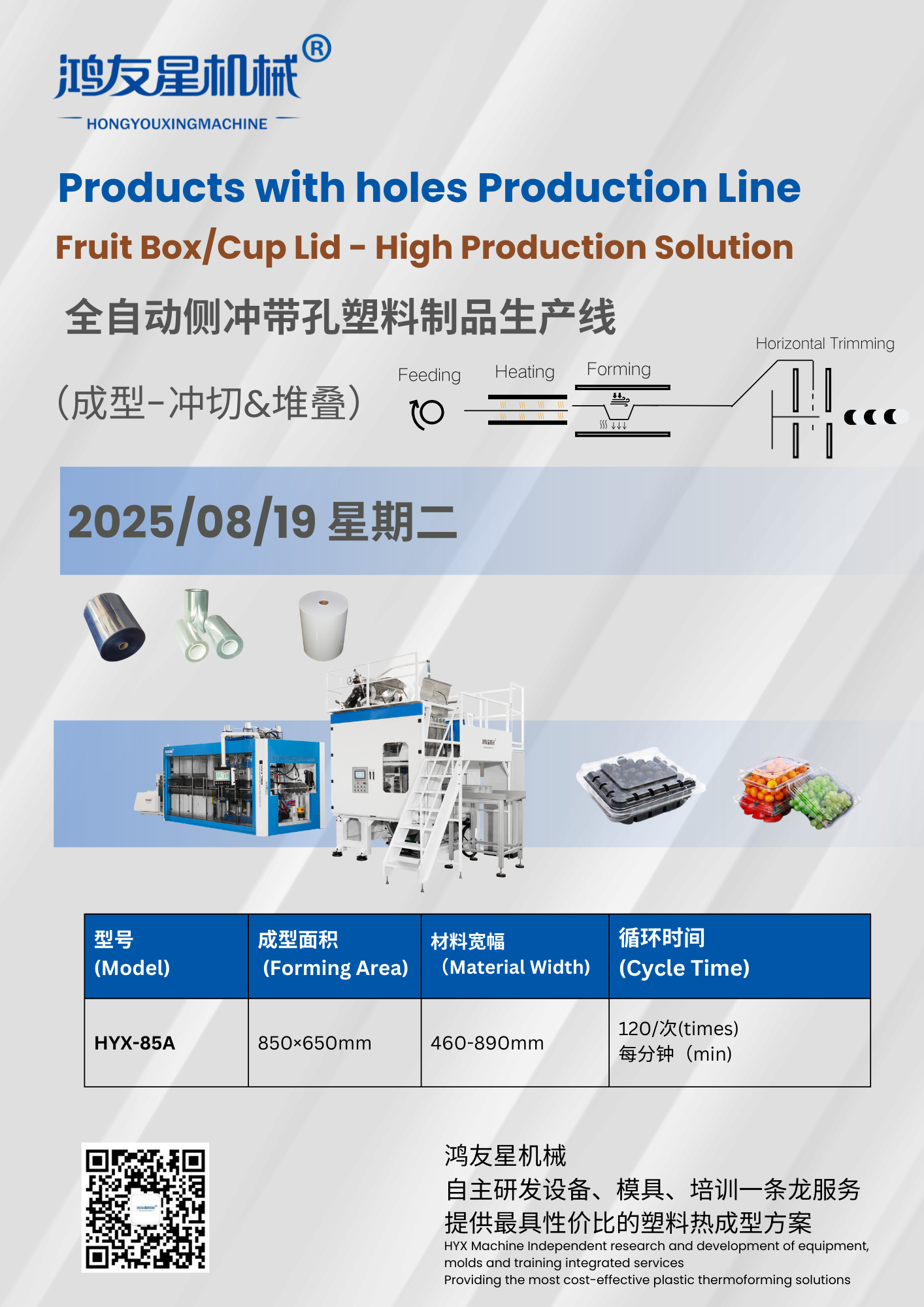 Oiriúnach chun clúdaigh cupáin, boscaí sútha talún, agus boscaí blister a tháirgeadh le poill taobh agus bun, meaisíní foirmithe blister (ar a dtugtar meaisíní blister / meaisíní tástála punchála freisin) is trealamh an-uathoibrithe iad atá in ann freastal ar riachtanais chasta pacáistithe agus a úsáidtear go forleathan go háirithe sa tionscal pacáistithe bia. Ní hamháin go dtacaíonn na meaisíní seo le foirmiú blister traidisiúnta ach cruthaíonn siad go beacht suímh éagsúla poll, mar shampla poill taobh agus bun, chun freastal ar riachtanais fheidhmiúla pacáistithe éagsúla.